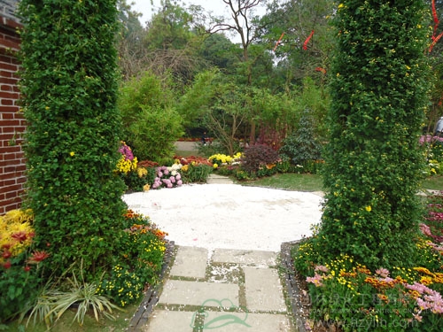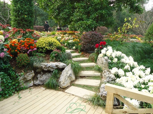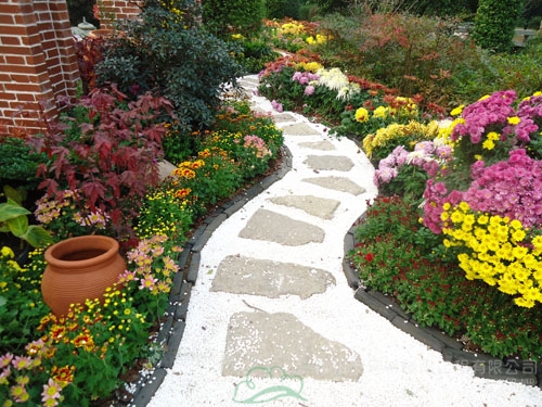 蜿蜒的园路、白色的石子、红色的陶罐、盛开的菊花