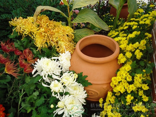 被菊花包围的红陶瓷罐