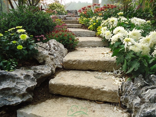 木质平台、石头、菊花