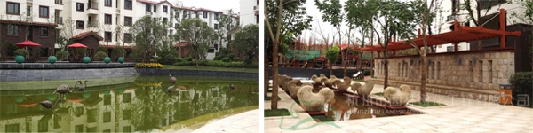 在紫荆东郡小区,水景随处可见,从主入口两侧近50米的景观桥水景,到入口正前方一个大型的石雕喷泉,再到小区里面几条主干道交汇的十字路口的小型地面喷泉,中心水景上的圆形石雕喷泉,特别是不远处的动物喷泉雕塑,只只鹤低头凝思,细长的水流从鼻端的出水口处流出,落入下方的水池里,更是格外引人注目。“这些水景小品具有的艺术特性与审美效果,加强了整个景观环境的艺术氛围,成为让空间环境生动起来的关键因素,在提高小区艺术品质和景观形象的同时,更给人们带来美的享受。”杨经理如是说。