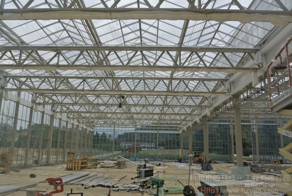 青山湖•花园中心工地正在施工的玻璃温室大棚