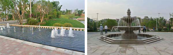 受中国传统文化的影响,中国人喜欢静观或观静,现代小区水景设计一方面可以满足人们对居住环境安静舒适的需求,另一方面通过适宜小区环境尺度的喷泉、涌泉、叠泉等动水,增加小区环境的生气及灵动性,给人们以感观的刺激,用水的动态之美与水声之美让身处闹市之郊的居民体会"山水有清音"的意境与自然美景。