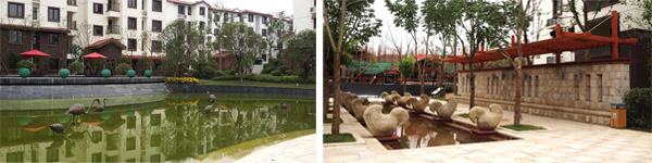 在紫荆东郡小区,水景随处可见,从主入口两侧近50米的景观桥水景,到入口正前方一个大型的石雕喷泉,再到小区里面几条主干道交汇的十字路口的小型地面喷泉,中心水景上的圆形石雕喷泉,特别是不远处的动物喷泉雕塑,只只鹤低头凝思,细长的水流从鼻端的出水口处流出,落入下方的水池里,更是格外引人注目。"这些水景小品具有的艺术特性与审美效果,加强了整个景观环境的艺术氛围,成为让空间环境生动起来的关键因素,在提高小区艺术品质和景观形象的同时,更给人们带来美的享受。"杨经理如是说。