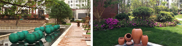 更值得一提的,还有随处可见的草坪,随着道路的延伸,草坪时而在不同的植物组团四周铺展,时而与一棵棵高大的香樟、无患子为邻,间或在小广场的四周漫生一片绿意。大面积的草坪应用,使得小区就像坐落在一片绿色的地毯中,映着白墙红瓦的建筑,更显绿意浓浓。不经意见,更见几只高低不一的红陶瓷罐随意散落在草坪里,在阳光的照耀下,泛出温润的光泽,一段静谧的时光,仿佛就这样凝固了。