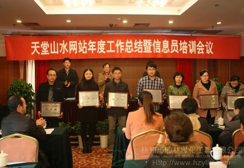 会议的重要环节之一为表彰先进。徐协平宣读获奖文件之后,周定炎、徐协平、缪梓伦为获得2012年度“天堂山水”门户网站的十佳单位、先进个人、优秀子网站进行了颁奖。其中,杭州市园林绿化工程有限公司网站被评为“优秀子网站”,于会莲同志被评为信息宣传工作“先进个人”。