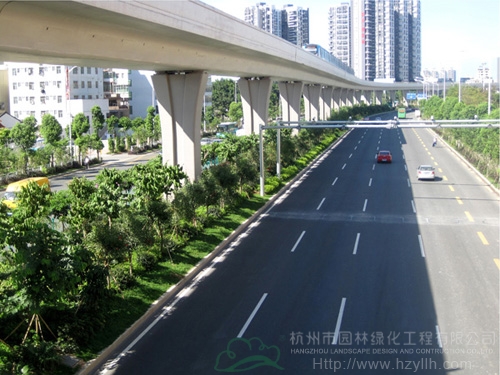 该工程最大的特色和亮点为:“以人为本,尊重自然”、“ 处处有绿叶,无处不飞花”等自然生态的设计理念贯穿始终;中央绿化带位于高架桥下,长势茂盛的各类植物形成一条缤纷绚丽的彩带拥簇着高架桥段,使整条桥段与绿化景观有机融合。2012年,该工程荣获中国风景园林学会“优秀园林绿化工程金奖”。