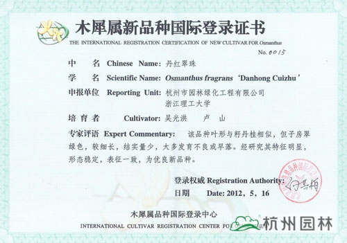 近日,由杭州市园林绿化工程有限公司与浙江理工大学联合研发的“丹红翠珠”、“杭州丹桂”、“杭州黄”、“菊瓣”、“万点金”5个桂花新品种获得木犀属新品种国际登录证书。截止目前,williamhill官网已经有12个桂花品种获得此项国际登录权,充分展示了企业在桂花研究方面的突出成绩。