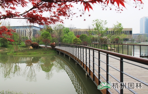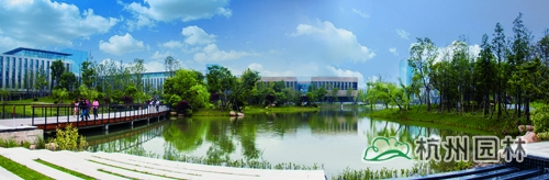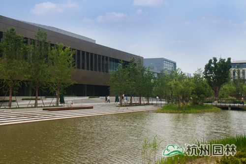 从滨江区江虹路的西入口处走进华为杭州生产基地,首先映入眼帘的是广场上大小不一的花池,一棵棵银杏、香樟、桂花生长得郁郁葱葱,昭示着无限的生机与活力。脚下的铺装,一边是菠萝格防腐木,一边是规则的花岗岩,一“软”一“硬”,相映成趣,蜿蜒延伸,直通前方的人工湖。清澈的湖水,在夏日阳光的照耀下,波光粼粼,偶尔一阵风来,一圈圈的涟漪荡漾,整个湖面都动了起来,让人忍不住加快脚步,去一睹前方的美景。这就是华为杭州二期生产基地景观绿化分包工程一标段的现场景观,该工程由williamhill官网承建,曾荣获2013年度浙江省园林绿化工程安全文明施工标化工地。