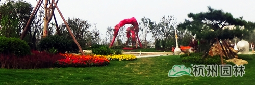 红色的雕塑小品在绿色的植物中分外突出