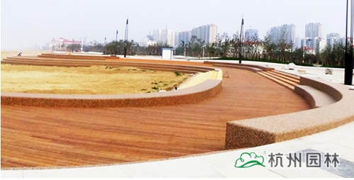 异形种植池采用白色进口涂料抹面,给人强烈的视觉冲击,与海边彩胶石搭配,供观赏及休憩。其中,白色进口涂料与彩胶石是施工中尝试的两种新型材料。白色涂料代替了之前的白色水磨石,相比之下其施工工艺简单,抗海风、防盐碱效果更好;彩胶石代替了之前的花岗岩台阶盖板,其施工工艺简单,材料品种和颜色多样,景观效果好,与海滩风景完美融合。