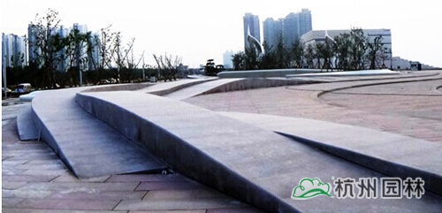 广场根据功能不同,分为七大观赏区,分别是露天剧场、雕塑小品、人行路桥、活动广场、异形种植池、滑板坡道、挡浪墙和波浪形台阶。