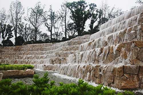入口水景开阔大气,行道树阵整齐划一。一场歌剧的序曲,不管是澎湃激昂,还是欢快活跃,抑或是柔情舒缓,都将对整个局情起着举足轻重的作用。入口景观的作用同样如此,它是整个园林工程留给人们的第一印象。走进项目主入口,宽40米、高10米的宽阔水景,高达7级的层阶落差,水流层层跌落间,水声轰鸣,仿佛一道瀑布横挂眼前。3000平方米的地面铺装,全部采用50毫米厚的深灰色和芝麻白花岗岩,走在上面,平坦、踏实。两侧的花坛,边缘铺设手法也呈台阶状,蘑菇石贴面,花岗岩压边,与水景遥相呼应。花坛中的植物,上层选用香樟、银杏、榉树,中层用樱花、红叶李,下层用麦冬、水蜡、花石榴及草花,再加上造型树的点缀,营造出群岛效果,使得整个入口景观庄重典雅,大气天成。