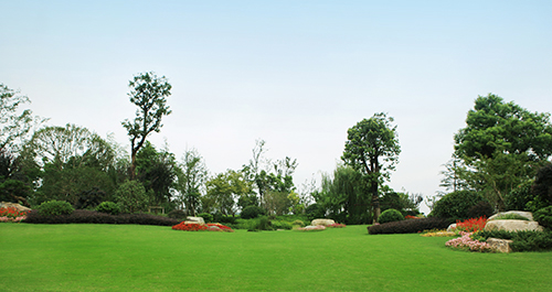 “永字八法”匠心独运,造型树木画龙点晴。中国书法是流动的建筑,凝固的音乐,它以精微笔墨呈现出博大精深的中国文化,是中国文化的代表性符号,更是世界艺术史上的奇葩。2号楼大厅门前,在大面积的草坪上,选用红花檵木、金边胡颓子、茶梅等一些小毛球,十分简洁地“书写”出点、横、竖、钩、提、撇、短、捺,即代表中国书法中笔画大体的“永”字八法,传达出“大道至简”的书法精髓。这种匠心独运的植物配置,将园林的造景手法与中国书法艺术完美配合,景观效果令人耳目一新。