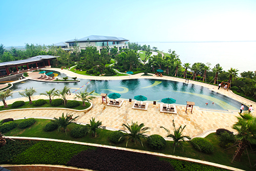 露天泳池热带风情,温泉泡池仿若天成。露天泳池区景观独具特色,选用华棕、棕榈、布迪椰子、加拿利海枣等热带植物作为主景,营造出简约大方、层次分明的浓郁热带园林风情。为了提高这些热带植物的成活率,降低后期的养护成本,这批植物都经过驯化,较能适应吴江的气候条件。该区面积较大,从酒店的观景平台上往下看,泳池中间的小岛就像弯弯的小船,仿佛要顺流而下;水质清澈见底,水底大面积的蓝色和黄色玻璃马赛克,营造出波光鳞鳞的效果,流动的线条瞬间充满了生机和活力,整个泳池仿佛都动了起来。