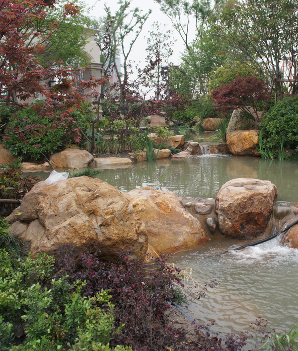 此外,景石的布置也是施工人员反复斟酌的问题,如何使景石的布置做到师法自然,对水流有阻有拦、动静结合,如何做到相石立景、主次分明,如何使景石的大小、高低、间距的分布错落有致,如何使硬质景观与软质景观完美结合等,项目部都进行了周密的考虑。