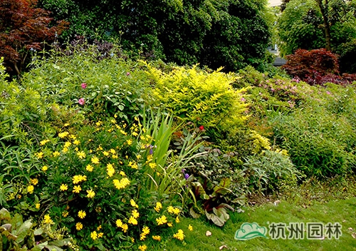 黄金菊花色金黄,在花境中色彩突出。其高度可达1.5m,可做花境背景材料、花境前景焦点材料,也可大片单独种植。