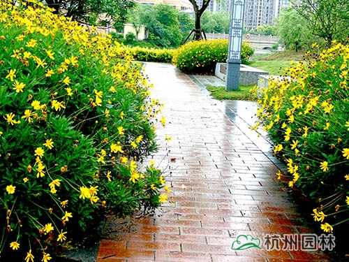 黄金菊长到一定高度易弯曲呈拱形,在路缘花境中可借助其这一特性使其枝叶、花朵垂落在地面上,形成夹道欢迎的热闹趣味。