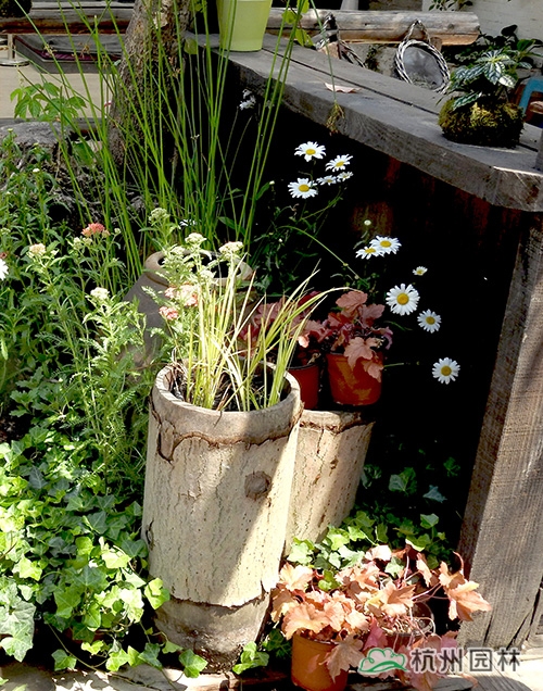 庭院一角,两株大滨菊、三两陶罐,一丛水葱、几株矾根、蓍草、金线蒲,形成简洁但不简单的景观。