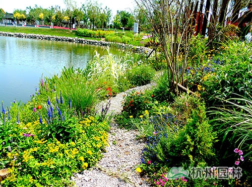 路缘及水边花境中,蓝色的穗花婆婆纳、六倍利,与紫红色的千屈菜、石竹,在以黄色为主色调的花境中起点缀作用。