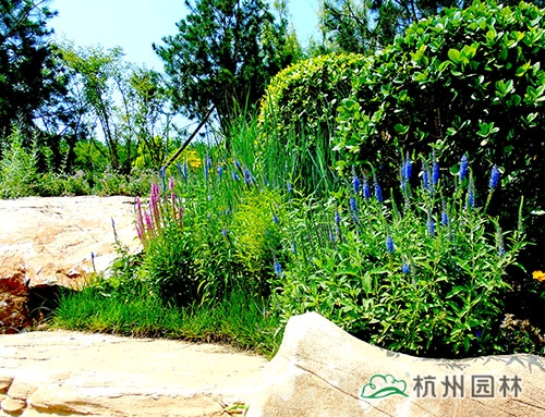 当球状的大叶黄杨与岩石相遇时,穗状的穗花婆婆纳起到良好的过渡作用。