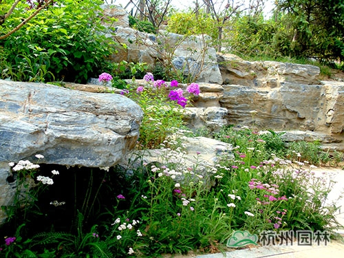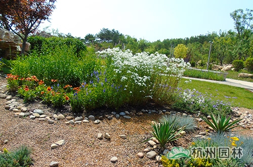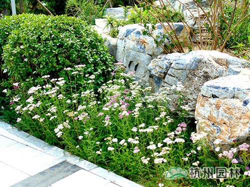 蓍草的伞形花序,配上柔软的竖向枝条,易在风中摇曳,野趣横生。其在坚硬的置石、石质小品旁,均能各自成趣。