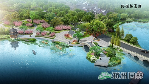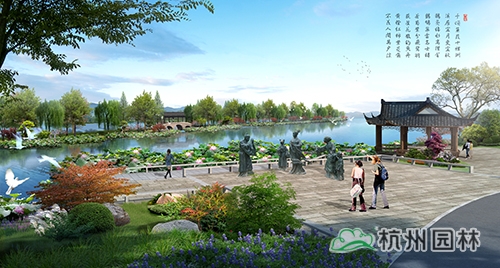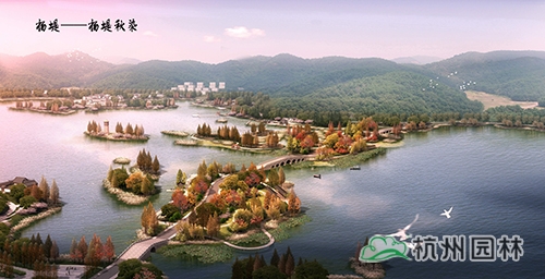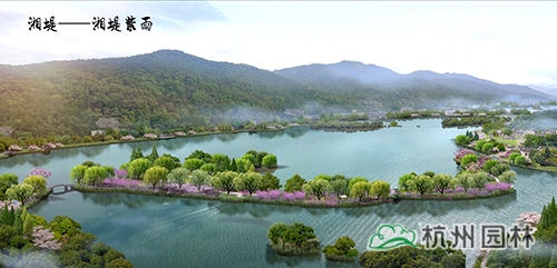 依据湘湖内部自北向南的五堤,各堤路赋以色相植物,打造湘堤紫雨、越堤红梅、杨堤秋染、长堤金风、贺堤碧玉。