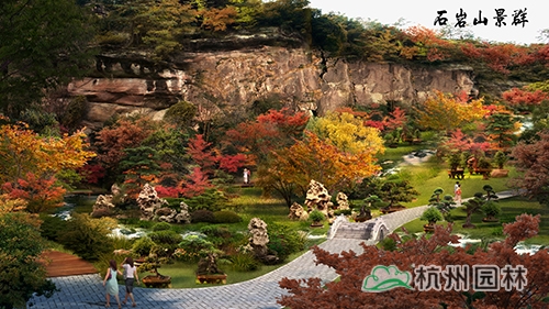 结合石岩山上有先照寺、一览亭遗址,补充秋色叶树种,突出石岩望秋的意境,结合鹅鼻峰八仙采药的传说布置牡丹草药园,展现湘湖养生文化。