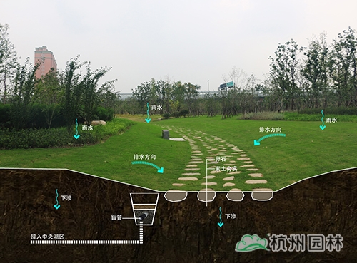旱溪布置于带状绿地低洼处。设计时仿造自然界中干涸的河床,配合湿生植物的营造,在意境上表达出溪水的景观。降雨时可减缓地表径流,起到缓排作用。旱溪底部接盲管,将水导入中央湖区,进行储存。