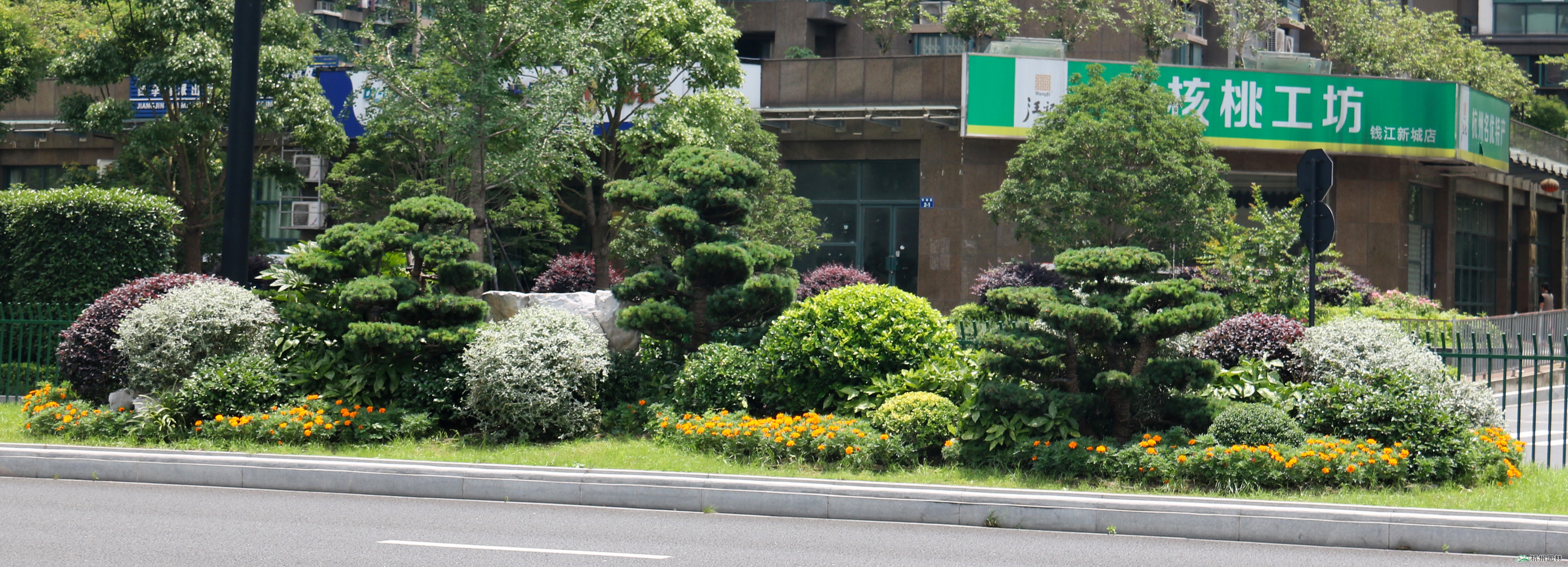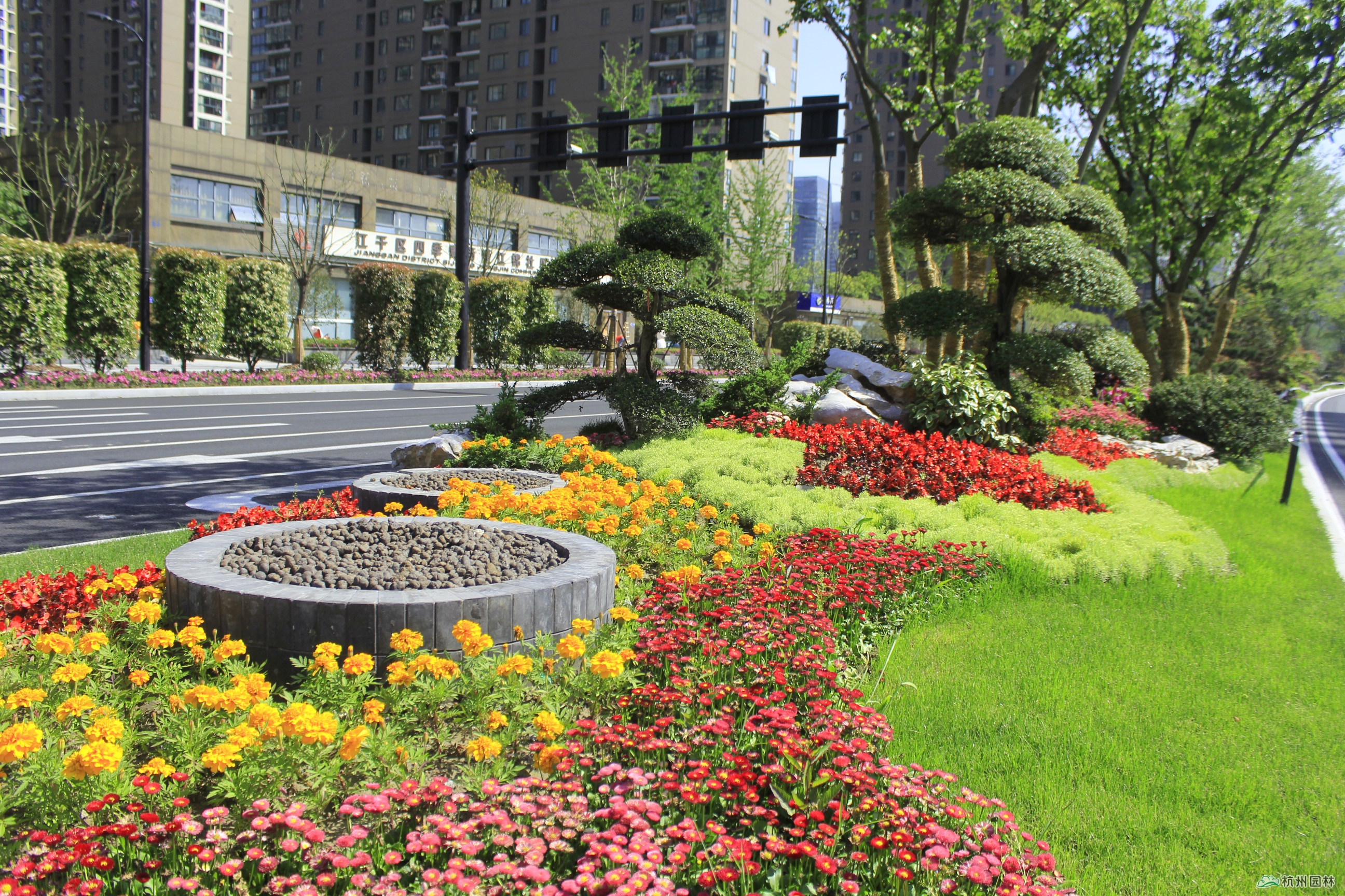 在道路十字路口及一些重要节点,则通过造型树、球类植物、景石等的有机结合,采用盆景化的造园手法,景观效果独具特色。从而使得新塘路成为四季常绿、三季彩叶、全年花开不断的“最美”迎宾大道。