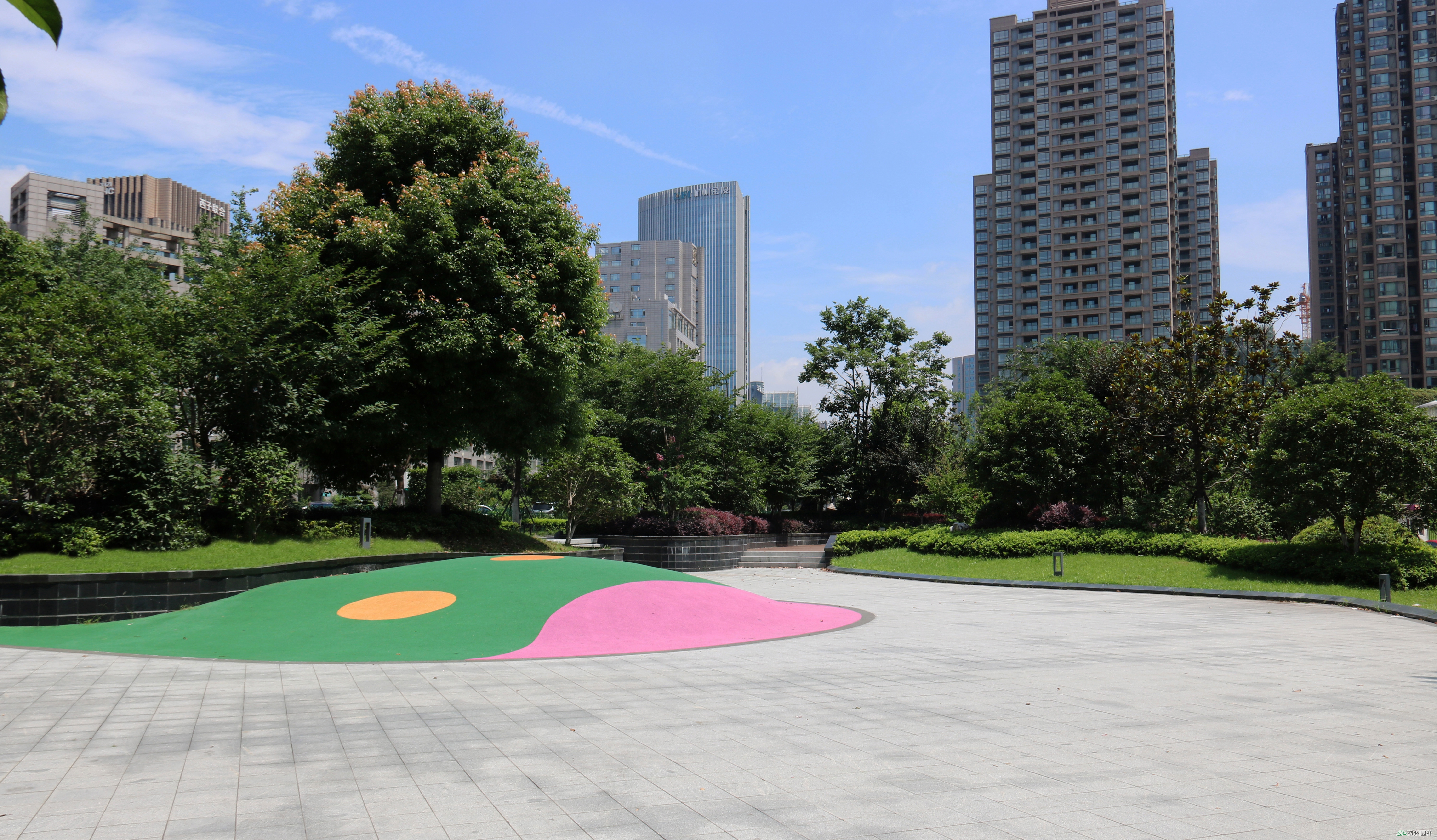 如在道路与沿街商铺之间的连接地,被打造成一个个整体统一而又特色鲜明的休憩空间,游人可以在其中通行,也可以漫步或休息。从空中俯瞰,新塘路宛如一条风景秀美的彩色飘带,开阔大气,充满生机,四季风景各异,车辆、行人各行其道,仿佛走进了诗情画意的江南园林。
