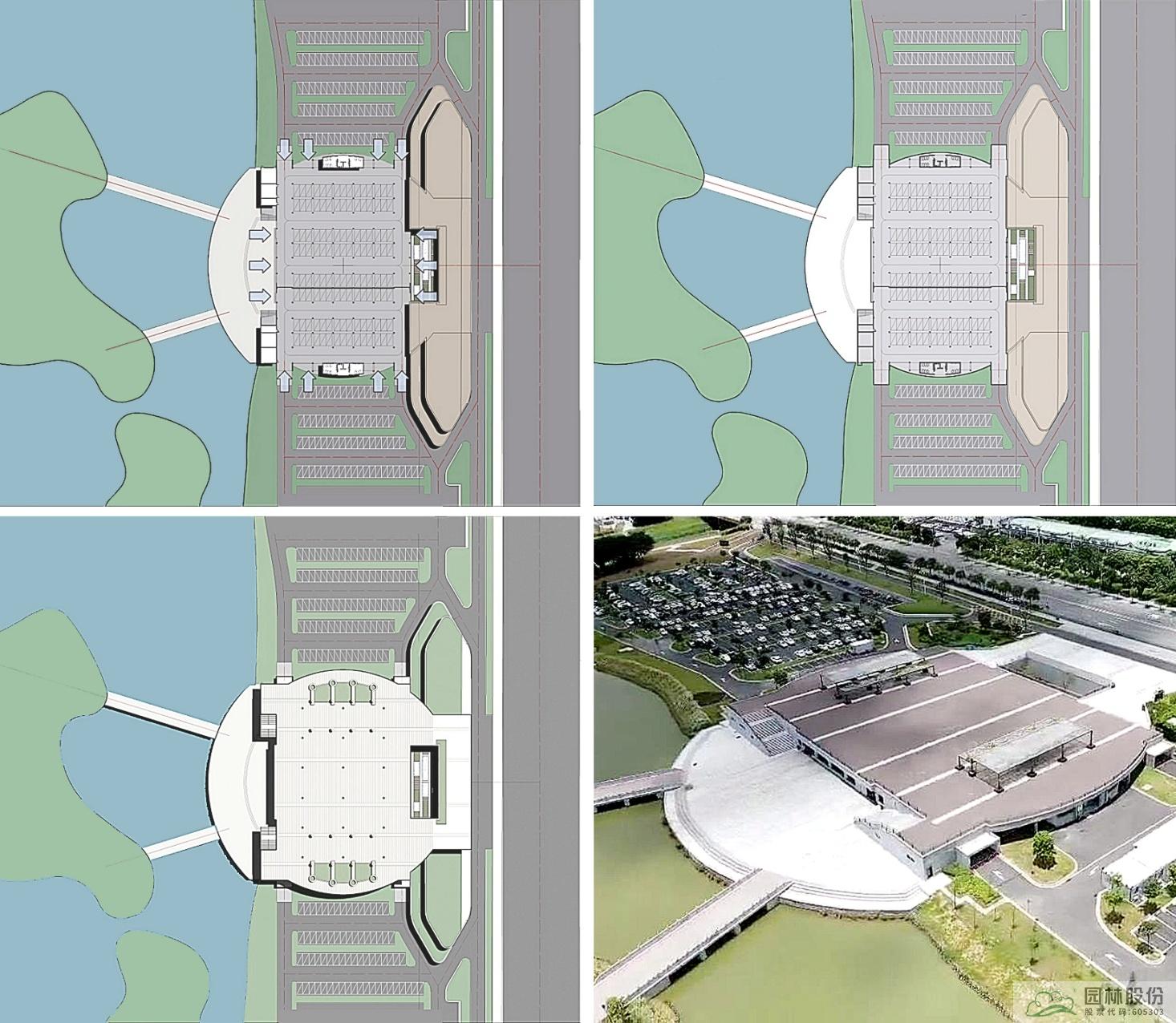 结合场地紧邻城市主干道和地形高差等特点,采用上架空广场和下停车库的竖向叠加布局形式,实现满足区域交通集散、拓展生态视野和人车分流等功能。敞开式停车库采用18组屋面导光管和中庭布局,在当地大部分季节无需人工能源。