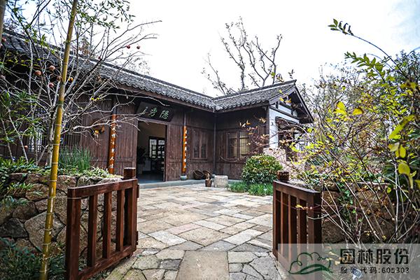 竹隐:主入口采用江南典型的错落双面门楼造型,木结构古雅清新,上书“家在钱塘”点明主题。正前方主题照壁形成障景,展现杭州园设计灵感与造园精神。