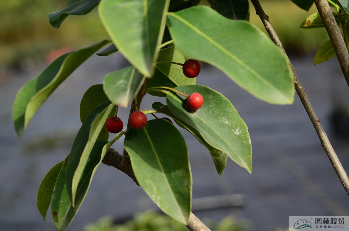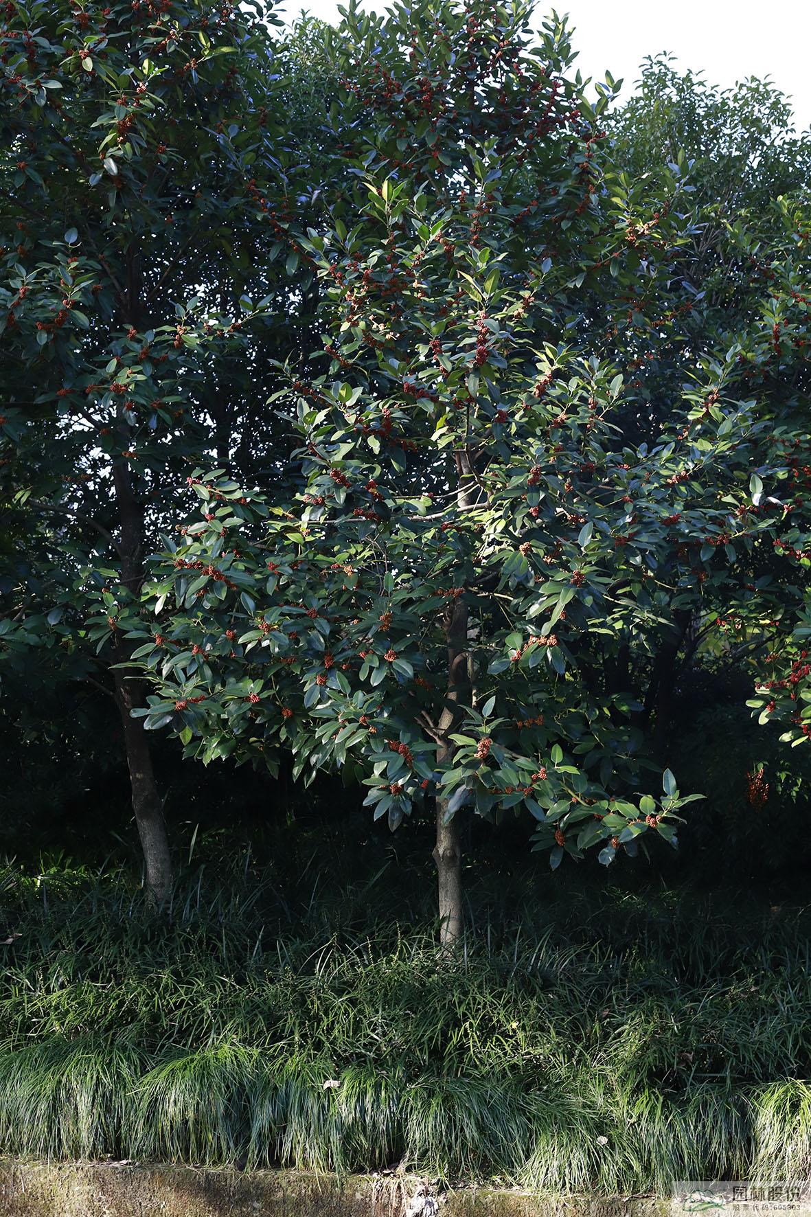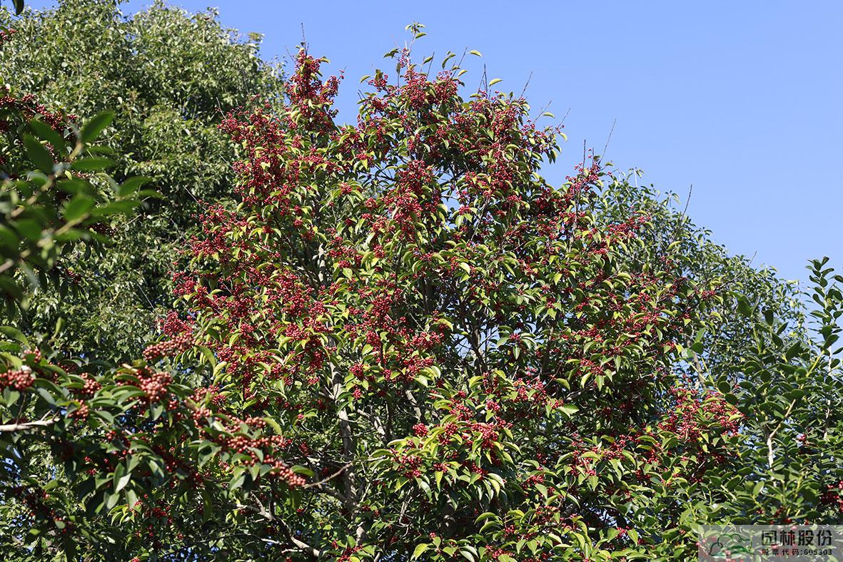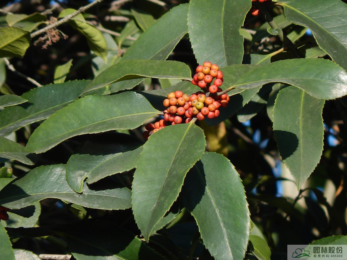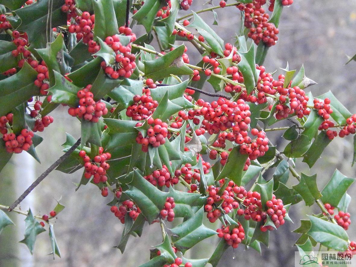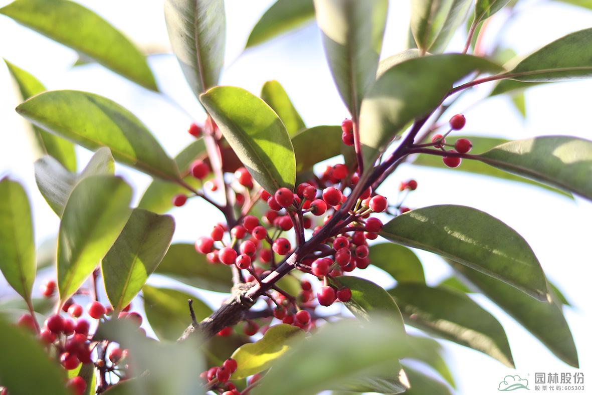 铁冬青:其叶子四季常青,故名铁冬青。为常绿乔木或灌木,高可达20米,叶全缘。果实红色,红若丹珠,小巧可人。挂果期长,能从10月一直持续至来年3月。因有多子多孙,兴旺发达之意,在民间俗称“万子千红树”。树皮或根皮为中药“救必应”,具清热解毒,利湿的功效。为优良观果树种,适宜在园林中孤植或群植。