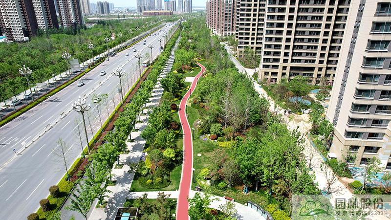 打破陈旧的交通环岛形式,以现代、简约、特殊的跌落式花坛,配置造型黑松、杜鹃、草花、草坪和景石营造自然、疏朗的交通岛景观;侧分带营造以娜塔莉、石楠柱相结合的特色景观大道;道路端头植被层次丰富,常绿乔木、开花小乔木、造型松搭配,加入木本花卉、草花、景石等元素。两侧绿化带植物造景,充分利用错落有致的地形,采用复层种植、品种多样、色彩搭配、疏密变化的丰富植物组团配置,形成四季常青,三季有花,步移景移。设施景观除了必要的灯具、标示牌、垃圾箱之外,还设置了极具观赏性,充满时代气息的雕塑、景墙等景观设施。旱溪部分更胜一筹,叠水、雾森、栈道、卵石、置石驳岸相结合,自然流线结合游憩设施布置。
