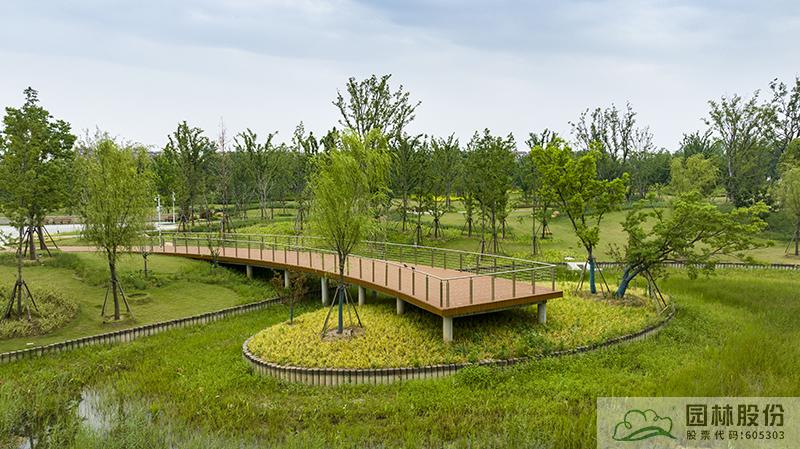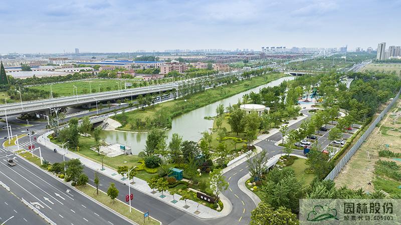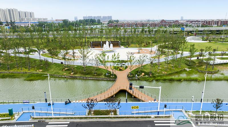 水系贯穿整段绿地,绿道、景观桥穿插其中,沿途设置平台、廊架等,充分呼应水网与路网交织主题。水系驳岸既有草坡入水,又有仿木桩驳岸,点缀景石,搭配疏密相间的绿化,共同形成了生态多样的生态水岸。