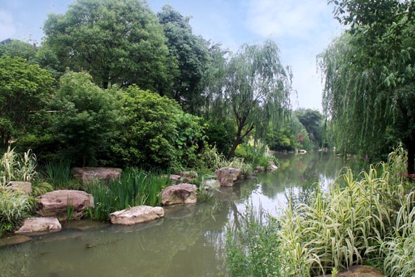 “水,是园林景观中的灵动之魂,也是江南园林的特点之一,特别是与800亩泱泱碧波的大淀湖为邻,绿洲•江南园别墅景观工程本身就有着营造水景的天然优势”,徐建良指着眼前的一处河水说,“为了营造自然、丰富的水体景观,工程中的水景不但有瀑、跌、溪、河、湖等自然景观元素,也有欧式中的喷、池等,中西方园林的水景模式有机融合,满足了业主们回归自然、享受自然的多样性需求。”的确,眼前这处蜿蜒的河道,驳岸两边自然地散落着大大小小的太湖石、黄石,慈姑、千屈菜、花叶芦竹、菖蒲等水生植物郁郁葱葱,岸边柳树垂下长长的柳条,偶尔一阵风吹来,水波轻漾,一幅浑然天成的水乡风光让人沉醉。